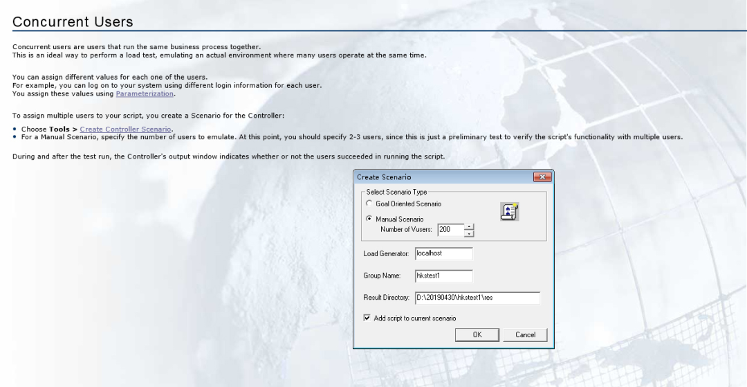 单击【Create Controller Scenario】弹出Scenario(场景)设置对话框,在场景对话框设置并发用户数(Number of Vusers)。
