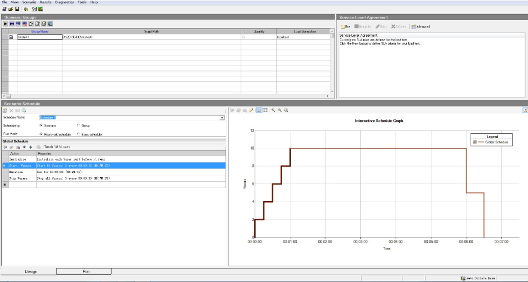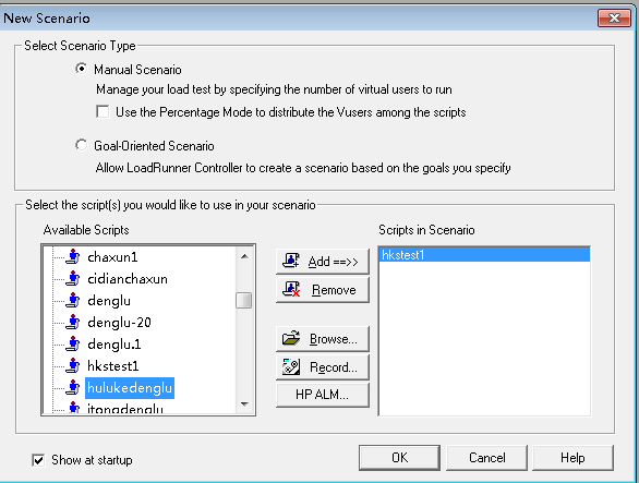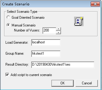 选项设置完毕,单击【OK】按钮。loadruner会启动场景测试窗口,在启动场景测试窗口前,会弹出对话框要求选择运行的脚本,选择先前保存的脚本,单击【OK】按钮。