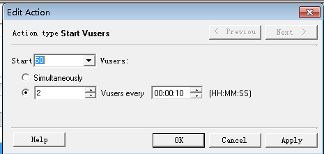 用鼠标双击“Start Vusers”项,loadruner弹出“Edit Action”对话框,设置起始的Vusers数量和增长频率。本次测试设置起始Vusers数量为50,每隔10秒增长2个Vusers。