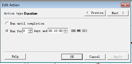 用鼠标双击“Duration”列表项,loadruner弹出“Edit Action”对话框,设置测试持续时间。本次测试设置持续10分钟。