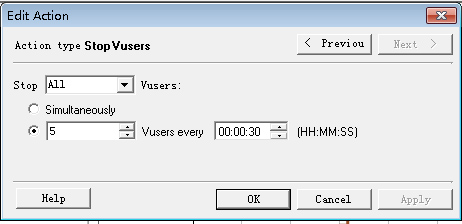 用鼠标双击“Stop Vusers”列表项,loadruner弹出“Edit Action”对话框,设置用户递减时间。用户递减时间是指用户增长到已设置的并发用户数量后,会按间隔时间自动关闭用户。