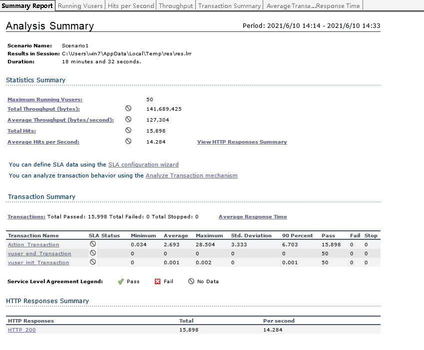 设置完毕,单击窗口工具条“Start Scenario”运行测试,loadruner将当前窗口切换到测试运行监控窗口,监控测试场景相关运行指标,包括 vuser数量、响应时间、每秒通过事务数、系统吞吐量等。