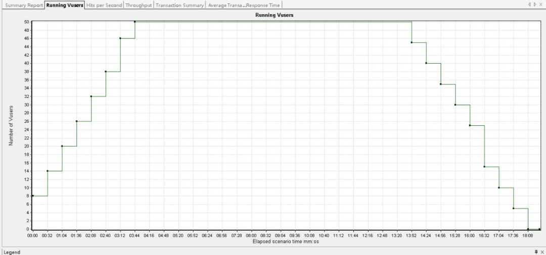 从图中可以看出,从测试运行开始,用户访问数量逐渐递增,3分44秒递增到50,其后用户数量不再递增。13分52秒,用户访问数量逐渐下降。