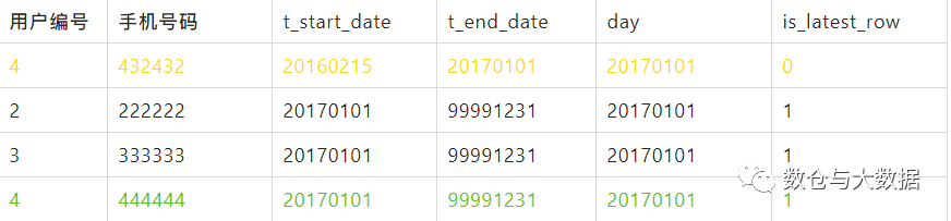 用户4 修改了手机号码,更新库里已有的那条数据 t_end_date='20170101',然后放入当天的 is_latest_row='0' 分区下,说明该条数据因为失效被归档了。新增的那条用户4 数据 t_start_date='20170101' ,t_end_date='99991231',放入当天的 is_latest_row='1' 分区下。