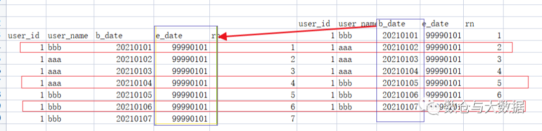 如果我们构建拉链表的时候,历史数据已经沉淀一段时间了,那么大概率我们是需要全量加工处理,并一次性写入进来的。当然,我们可以从第一天开始、一天一天的往后计算。