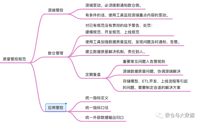 质量管控规范,之所以单独列出来,是因为数据质量,跟模型设计一样,对数仓建设的成败关系极大。试想下,一个数据质量都无法保证的数据仓库,有谁会用? 数据质量规范,主要是从数据流动的角度分为三类:源端管控、数仓管理、应用管控。
