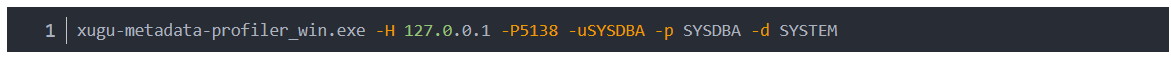 usage: xugu-metadata-profiler_win.exe [-h] [-H HOST] [-P PORT] [-u USER] [-p PWD] [-d DATABASE_NAME] [-v]