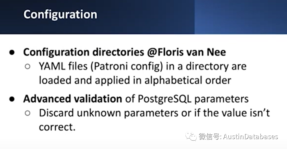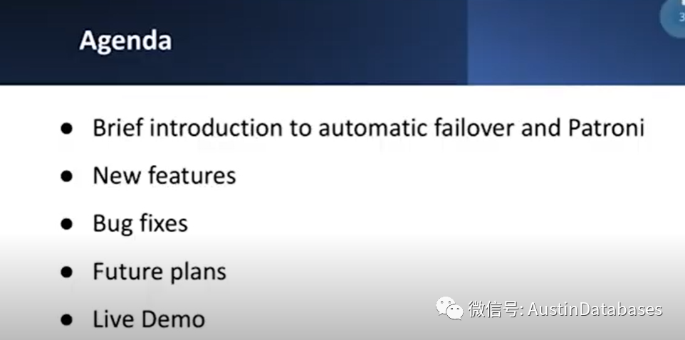 大家好我叫亚历山大.库是金,今天我给大家介绍的是patroni 3.0的一些新的规划和功能,主要有以下的一些议题,功能介绍,问题的修复,以及新的功能。
