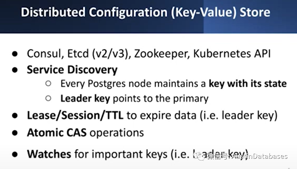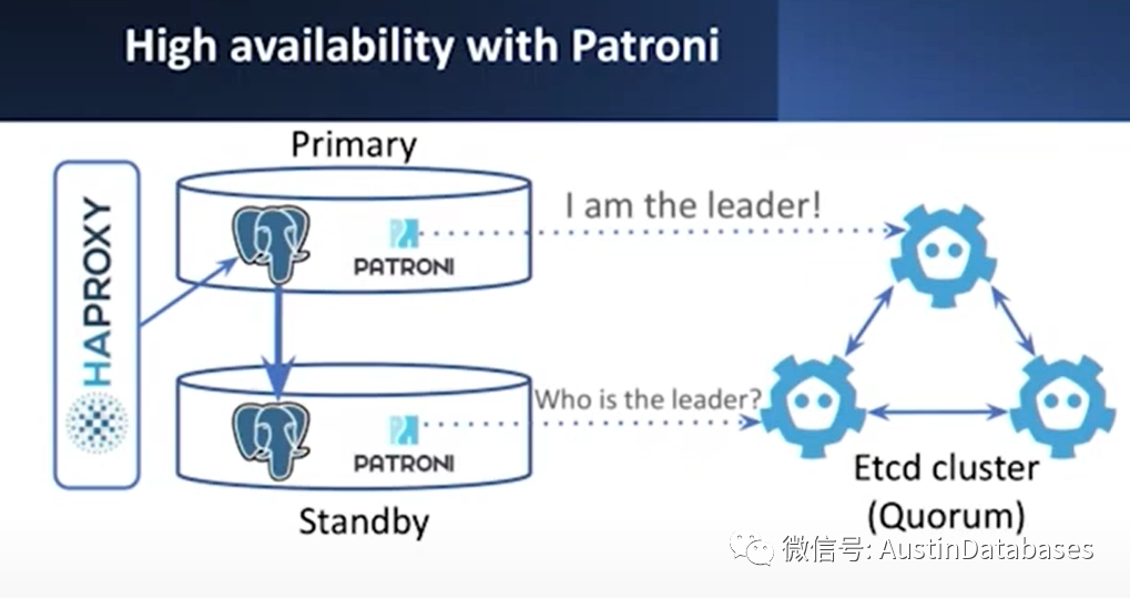 Patrnoi 本身支持多种部署,包含最小化部署,支持多种的分布式组件,主要是ETCD ,通过分布式服务,来自动发现节点的状态情况,并将状态进行汇总,通过leader key 来标识当前的primary point 节点,同时这里状态会根据TTL 进行状态在获取,key 是有租约的,所以这些key会在租约到期失效后,进行key 的更新。