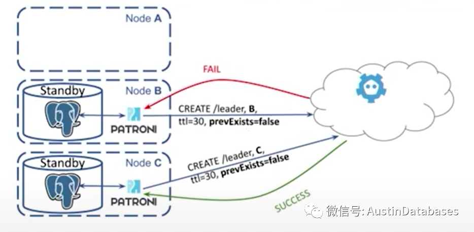 当主库出现故障,无法进行KEY 的状态更新,相关的主键的信息就会被抹去,这里的故障的起因,有网络的原因或者主机的原因,数据库服务的原因等等。当超过最大的等待时间后,剩余的两个节点 B C 开始进行选主的竞争,因为他们都发现A 节点不存在了。