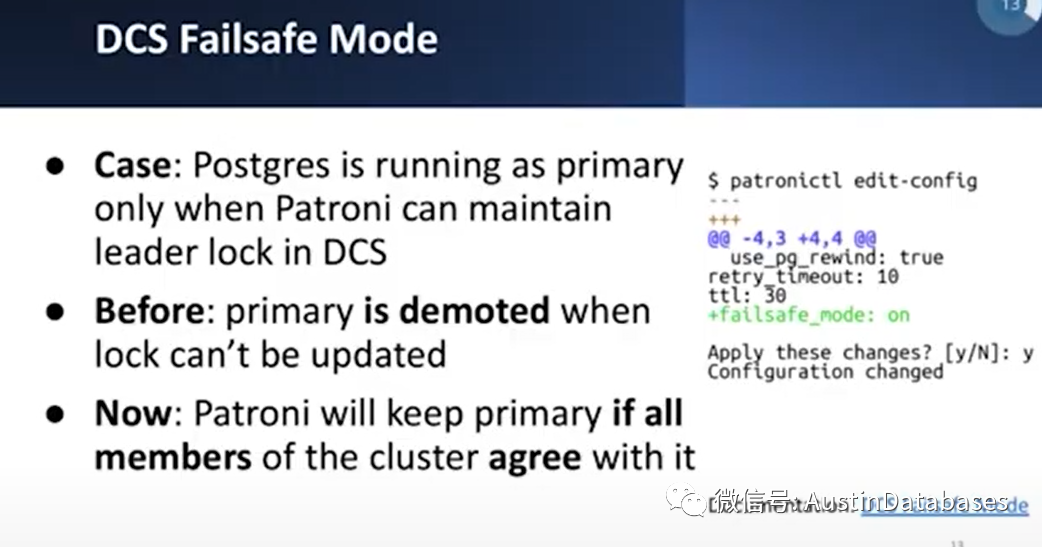 在之前的版本的PATRIONI 中有一个问题关于 DCS 导致的误切换的问题,DCS(Distributed configuration store) ,之前的版本的patroni 主要依赖DCS 来解决LEADER 的选举和检测网络分区的工作,这里primary 节点必须在DCS 中更新数据,才能持续的成为主节点,但如果更新失败,则无法成为主节点,PG 会将主节点降级,为解决这个问题,我们引入了一个新的选项,failsafe_mode 他通过在DCS/config 中的全局动态配置进行启用,这里如果主节点可以通过patroni rest api访问到集群中的其他成员,那么这个主节点即使无法更新数据,那么也会持续保留主节点的状态,不会随意降级。