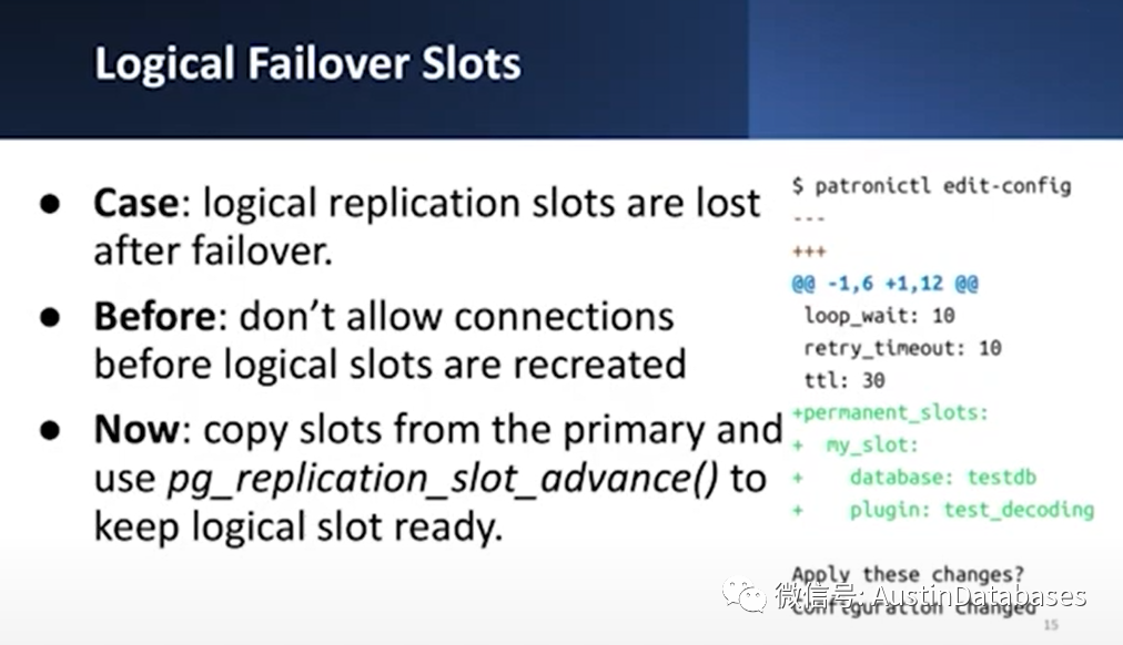 另一个更新主要是在生产系统中,有使用逻辑复制槽的情况,在进行主从切换的过程中,复制槽会丢失的问题,在之前我们不允许在Patroni 的系统中,重建逻辑复制槽,现在我们可以通过函数pg_replication_slot_advance 来重建复制槽。