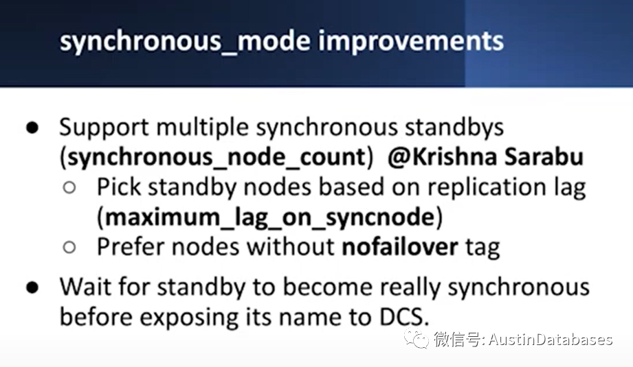 同时在3.0 针对支持多个同步方式的从库,切换是基于replication lag 的,切换中会更倾向于安全切换。