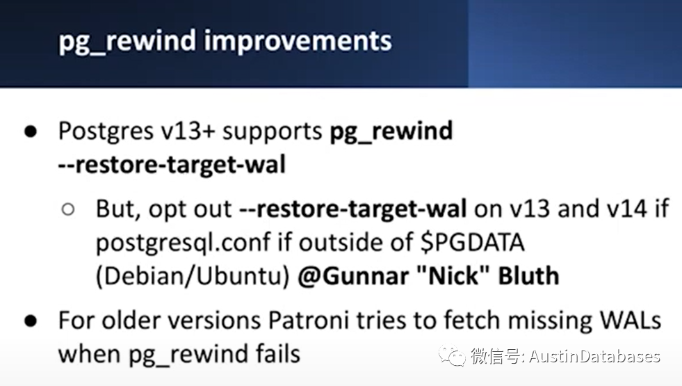 支持PostgreS 13版本中PG_REWIND 中的 --restore-target-wal 的功能,通过但这里不包括在Debain/Ubuntu 中部署的PG13 14 版本。