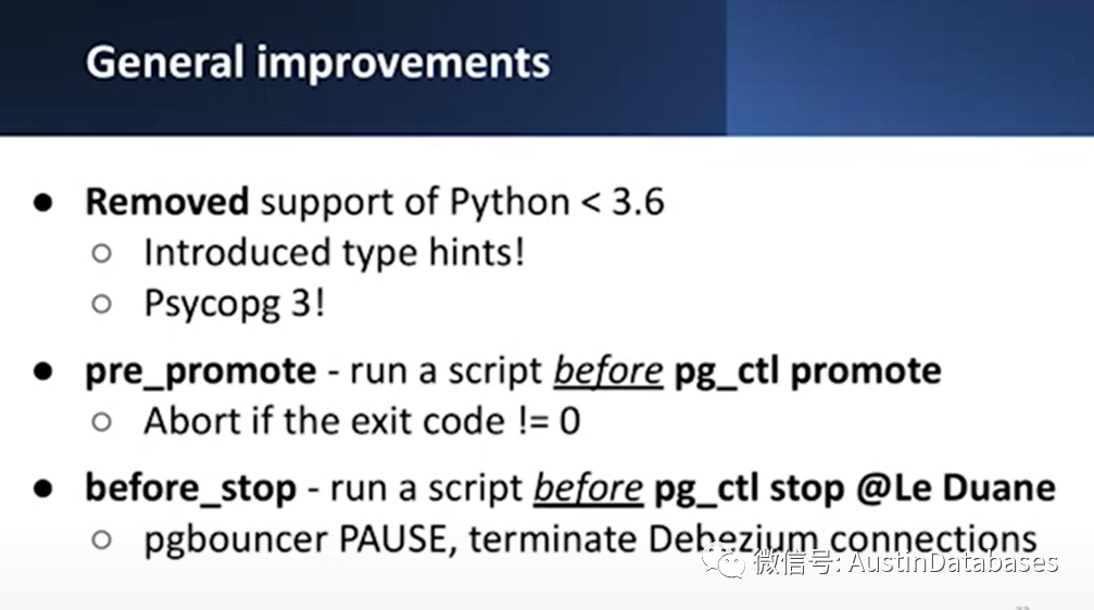 另外还有一些软件方面的改进和增强,我们彻底不在支持低于3.6一下的PYTHON , 并且要使用psycopg3 ,这里我们也会在操作pg_ctl promote 命令前来通过预先的一个脚本,我们认为是一个钩子,来进行一些安全性的判断和切换前的预先的工作。通过也在关闭节点命令前会通过脚步来做一些准备工作,必然把pgboucer先暂停了的工作等等。