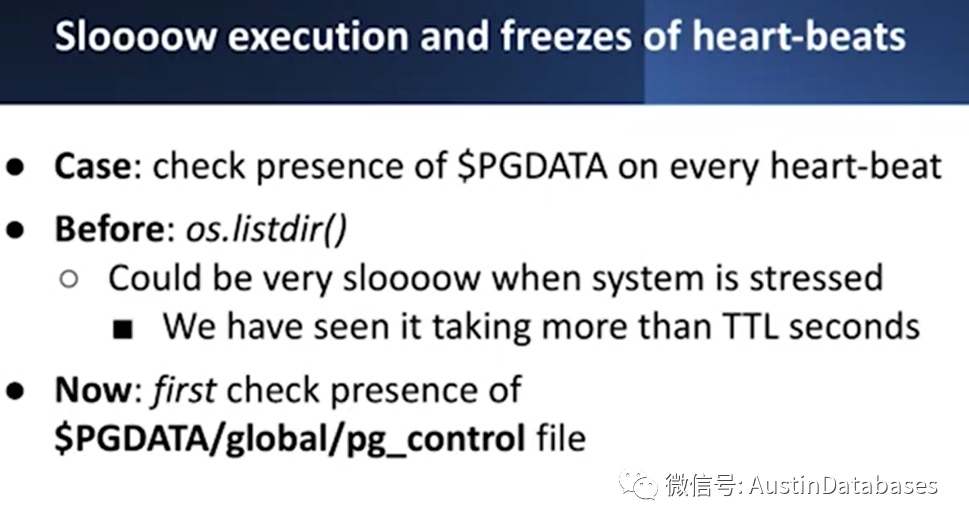 另外在判断PG 是否存活中,也需要去检测PGDATA 变量, 之前是通过os.listdir()函数来进行判断,但是这里反映的速度很慢,这里我们改变方式通过pg_control文件来获得第一次的数据。