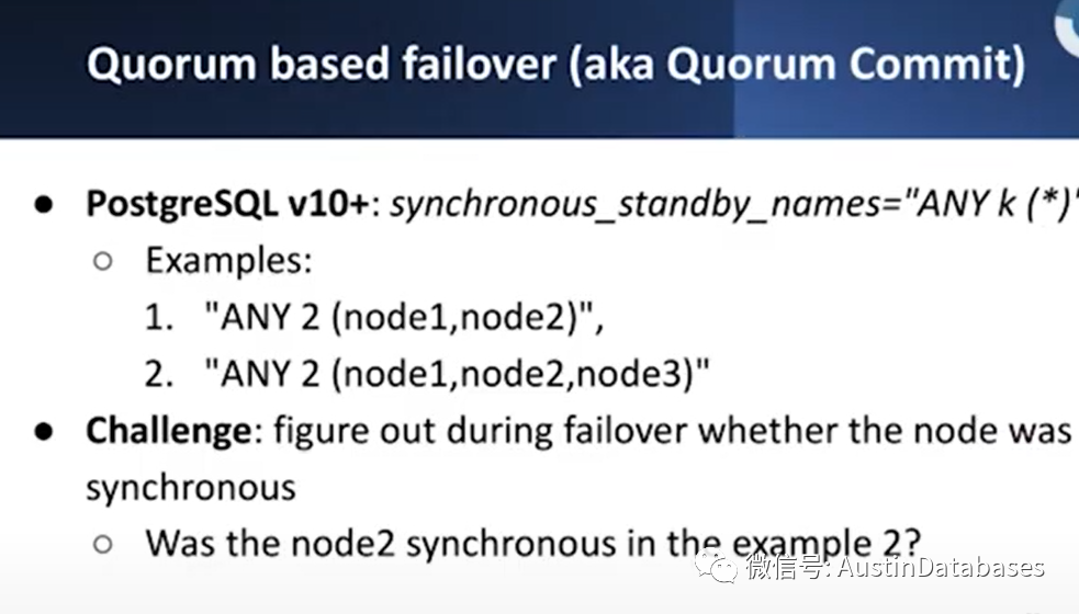 今天是星期六,外面的阳光真好,我没有那么多的时间说,(这不是杜撰这是他的原话),5年前PG10 添加的功能,关于同步复制节点的设置,我们看下面的例子 ANY2(node1 node2) ANY2(node1,node2,node3),如果要切换我应该切换那个,谁能告诉我怎么办?