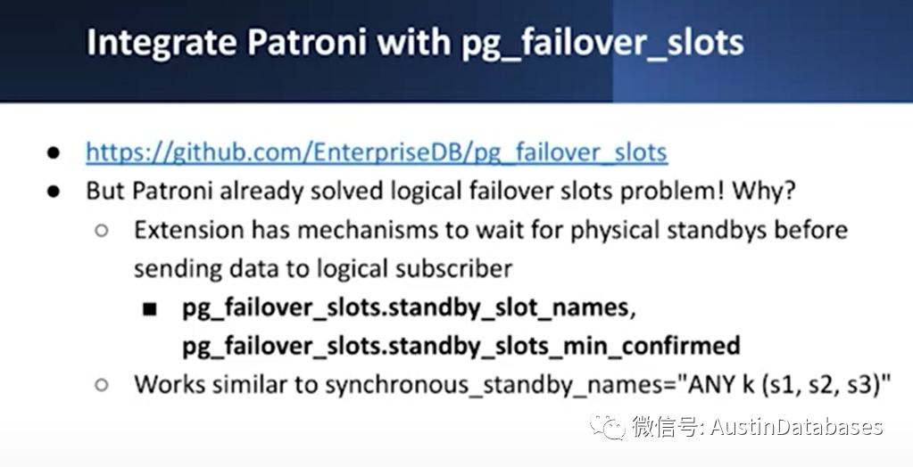另外我们也准备在patroni 中整合关于复制槽failover的部分,虽然patroni我们有了自己的解决方案,但是我们有一些问题没有解决,所以我们在后面要整合新的解决方案,来弥补我们自己的解决方案的问题。