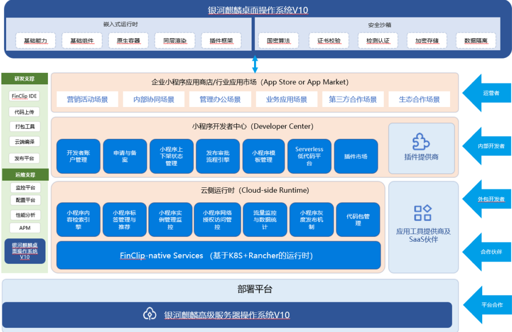 在某国有大行小程序生态平台建设中,采用银河麒麟高级服务器操作系统和小程序平台FinClip搭建了自主安全的私有化小程序生态平台,在行内多个App上线100余款小程序。App通过FinClip 引入上百家优质服务的同时,技术对接周期缩短80%,行方对接人力成本节约60%,行方将原有微信小程序平移至银行App,业务功能再开发成本降到0,实现降本增效和流量大幅提升。