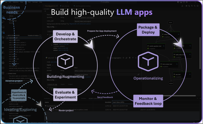 Prompt flow 作为 Azure LLMOps 的突出能力,促进了前所未有的 LLMs 的可扩展性和编排,精确管理多个 prompt 模式。它确保了强大的版本控制、无缝的持续集成和持续交付集成,以及对 LLM 资产的持续监控。这些属性显著增强了 LLM 管道的可复制性,并促进了机器学习工程师、应用程序开发人员和 prompt 工程师之间的协作,帮助开发人员实现一致的实验结果和性能。