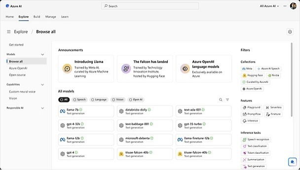 除了 GPT-4 和 DALL-E 等在 Azure AI 服务上运行的 OpenAI 前沿模型之外,Azure AI 还拥有强大的基础模型目录,其中包括 Meta 的 Llama 2、Falcon 和 Stable Diffusion。通过使用模型目录中的预训练模型,用户可以减少开发时间和计算成本,快速轻松地启动项目。丰富的模型选择使开发人员能够在 Azure 的端到端内置安全性和可扩展性的支持下,充满信心地定制、评估和部署商业应用。