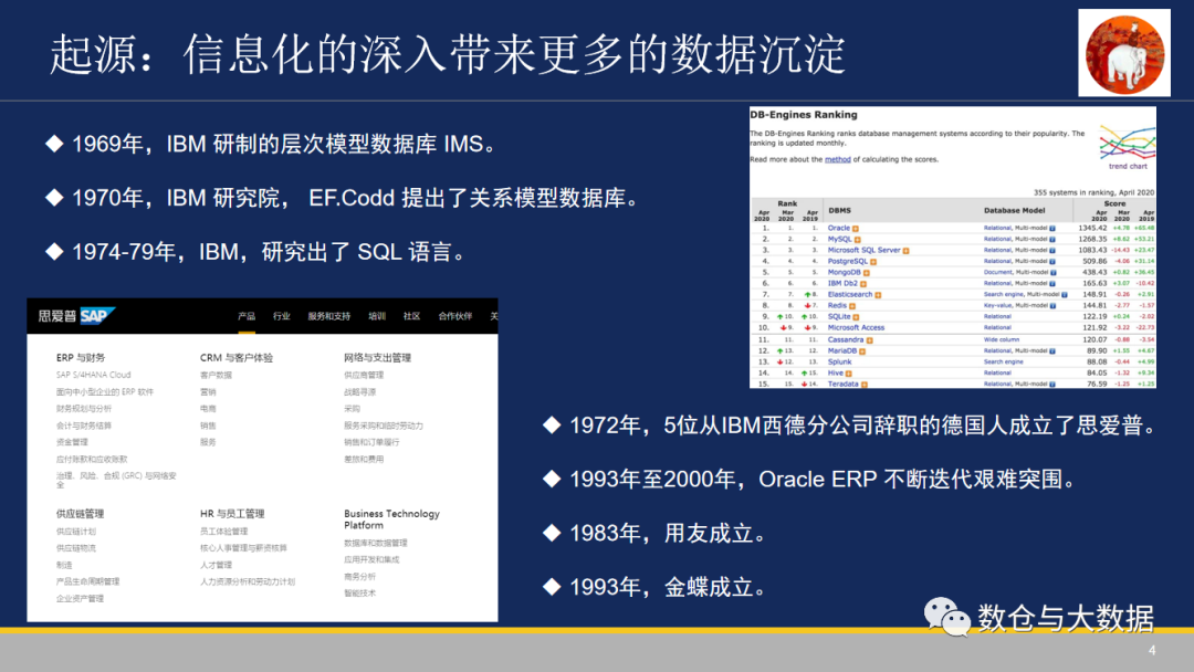 一条线是数据库技术的诞生发展与逐渐成熟。另一条线是各种 ERP、CRM、办公自动化、财务系统、供应链等软件解决方案的完善推广,数据库技术发展和各种软件产品推动,共同促使信息化进程不断的深入。