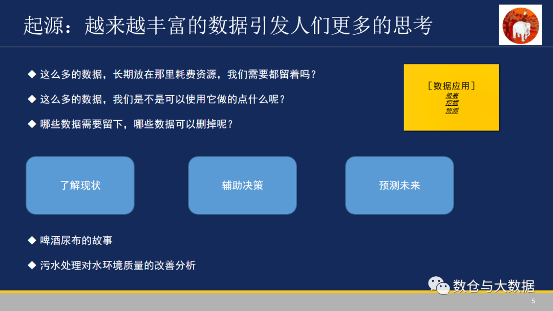 反应历史变化。存储大量的历史数据,保留历史所有数据的状态,进而找出企业经营管理中的规律。我觉得这里应该包含两个层面:业务的历史变化规律、维度数据的历史变化。