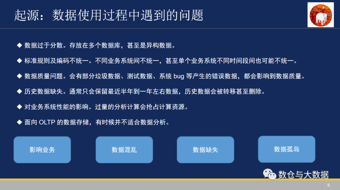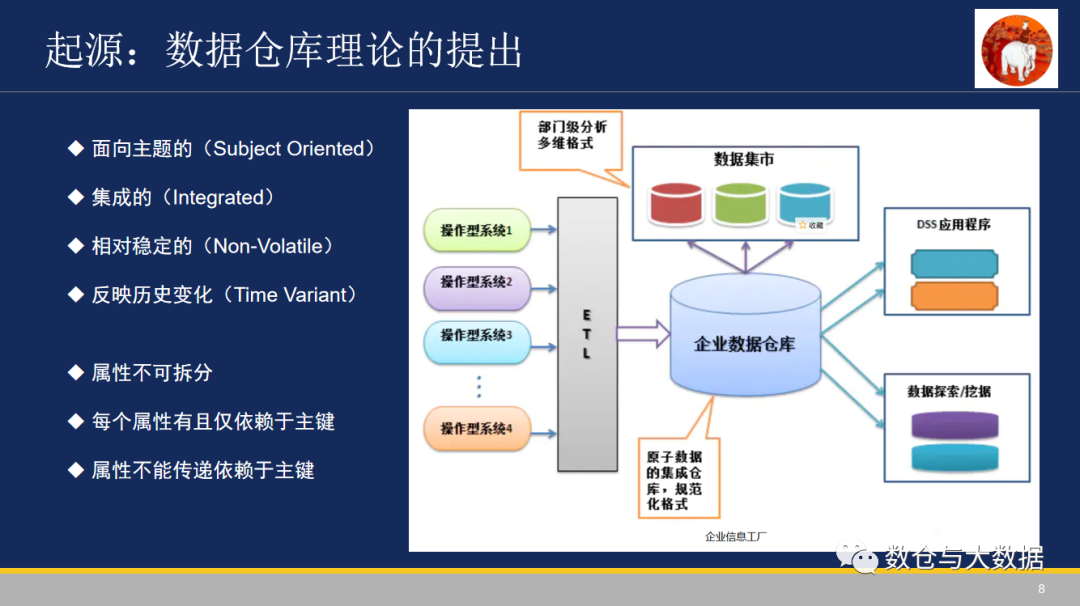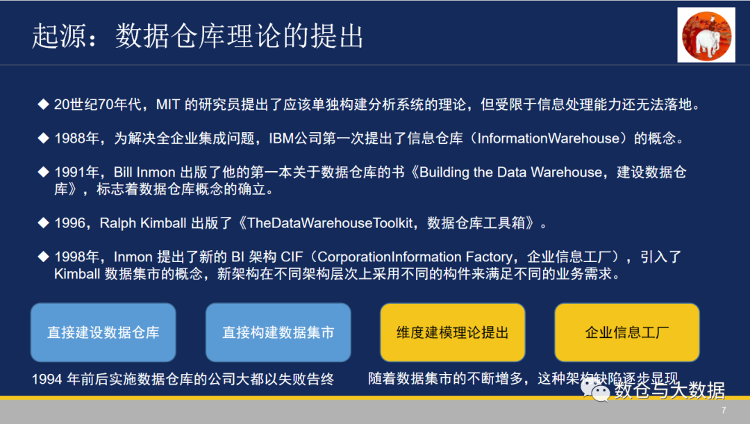 事实上,在上世纪 70 年代已经有人提出来需要单独构建数据分析系统了,但是局限于技术发展一直无法落地(大家可以往前翻到第 4 页 PPT,那时候的关系型数据还处于启蒙阶段。),直到后来 1991 年“数据仓库之父”正式确立了数据仓库基本概念,但直到那时候数据仓库理论依然不太成熟。