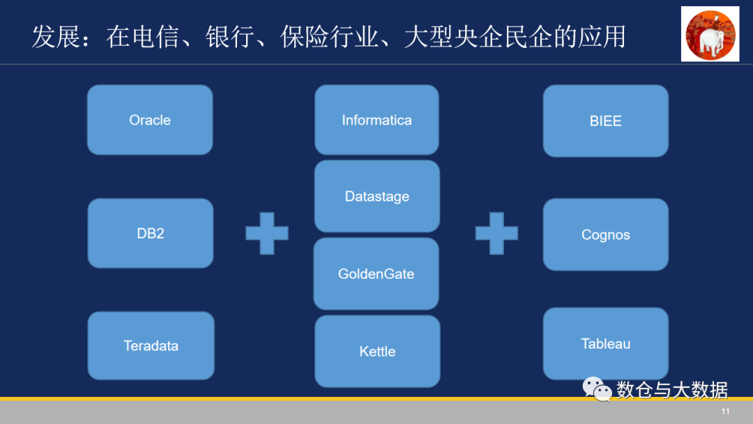 请看上边这张 PPT,从左到右,软硬件提供商+解决方案提供商+外包公司,这些都是传统数仓的主要参与者。大概场景是这样的:解决方案提供商拿着外企的一众产品简单包装以后,在国内接项目,然后带着一大堆外包公司做实施。当然上边的分界也不是特别明显,华为也提供硬件、TD 也会做实施。