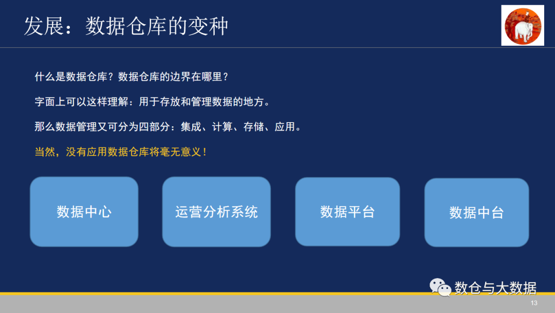 数据管理大体可以分为四部分:集成、计算、存储、应用。狭义的数仓只包含集成计算和存储。但是没有上层应用的数仓根本毫无意义,所以数据应用对数仓来说也是至关重要的。