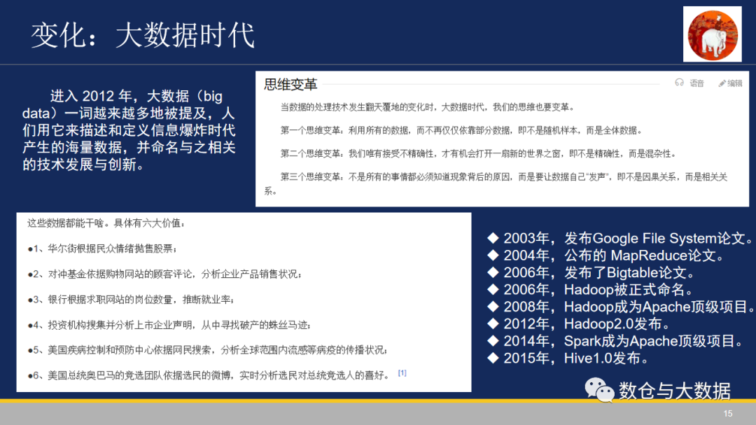 伴随大数据时代的到来,带来了数据技术架构的重大变革,同时赋予分析挖掘更大的能力。