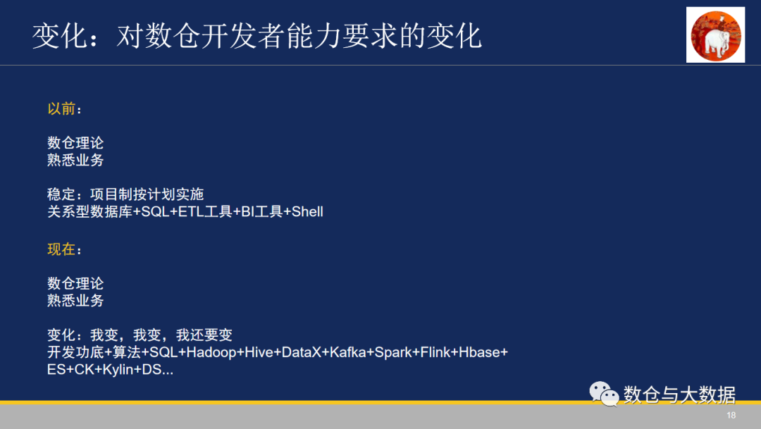 数仓的变化,随着大数据时代的到来,人们对数据资产更加重视,数据赋能业务能做的事情其实是更多了。那么传统数仓向大数据仓库的演变,对数仓人的基础能力要求有哪些变化呢?我会在第三部分给大家做个介绍。