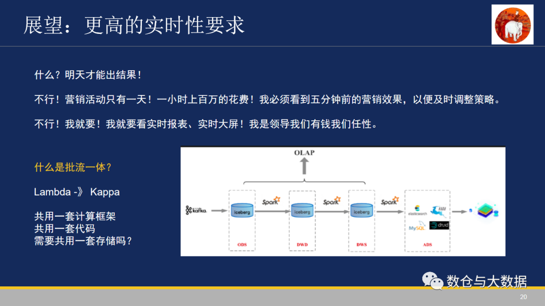 目前为止,我们大致处在大数据仓库的阶段,并且已经有很多人在不断的做着新的尝试,第四部分我会基于我所看到的,跟大家共同探讨下数仓未来的演进方向。