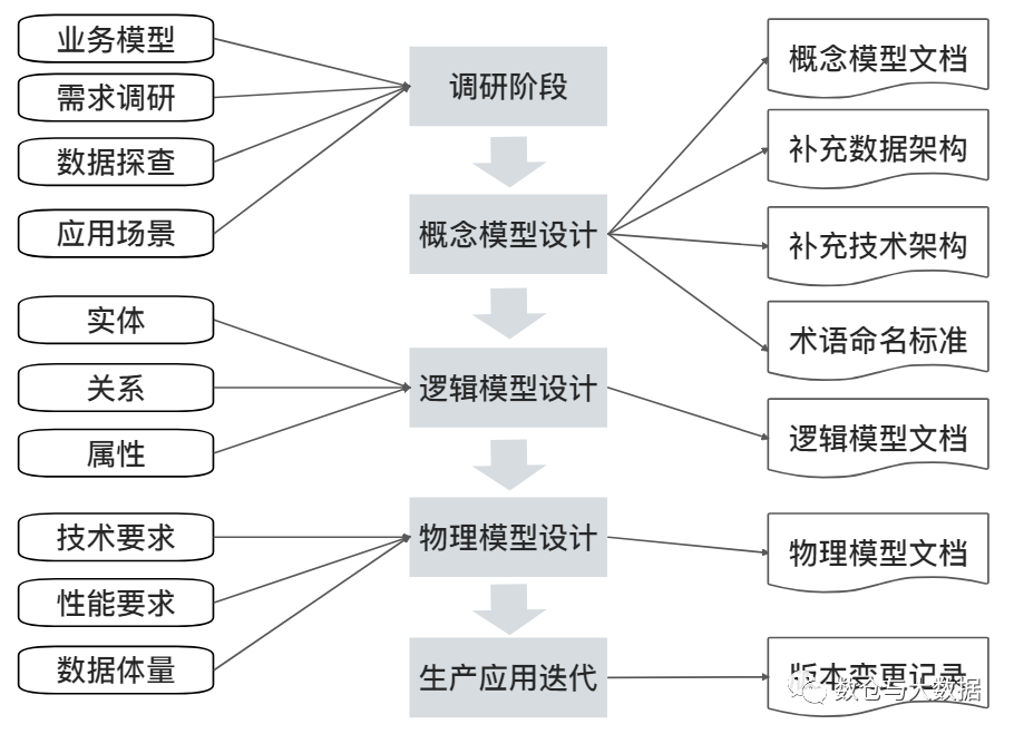 调研阶段 --》》概念模型 --》》 逻辑模型 --》》物理模型 --》》生产应用迭代