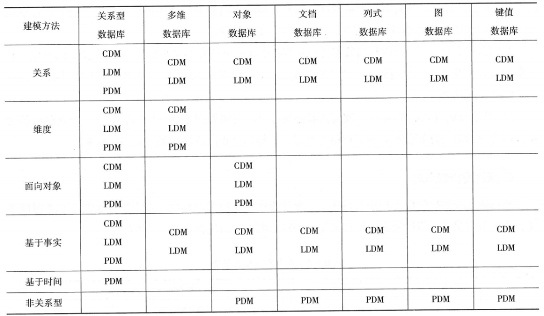 上边表格,是 DAMA 2.0 给出的建模方法和数据库交叉应用模式。