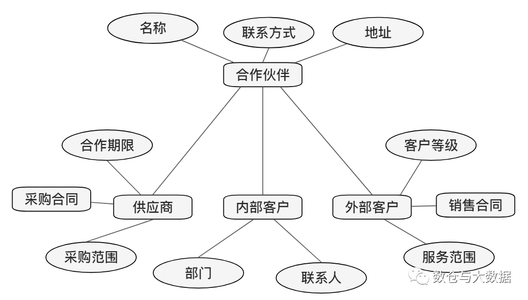 上文所说的规范化主要实现方案就是拆分,下边是临时写的一个集团公司合作伙伴的实体-关系-属性样例,写的很简单大家看懂问题就行。