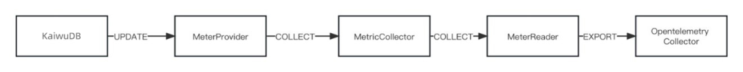 在 KaiwuDB 的监控中,使用了 Opentelemetry 的 Metrics API,创建 Gauge 和Counter的方法,并将其注册到 opentelemetry 的 MeterProvider 中。同时,使用 otlp exporter 将指标数据发送到远程的 OTLP 收集器。