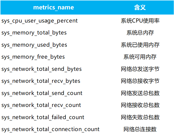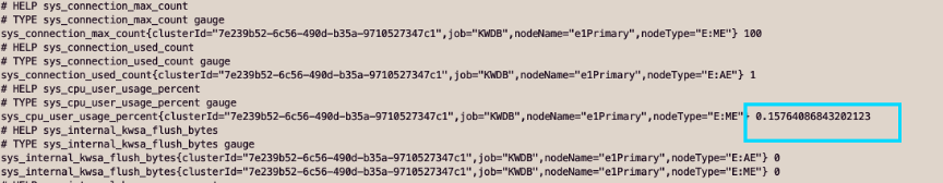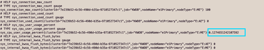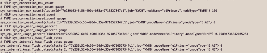 # HELP sys_connection_max_count# TYPE sys_connection_max_count gaugesys_connection_max_count{clusterId="60a10600-497b-4186-88d0-bacafe0a1857",job="KWDB",nodeName="e1Primary",nodeType="E:ME"} 100# HELP sys_connection_used_count# TYPE sys_connection_used_count gaugesys_connection_used_count{clusterId="60a10600-497b-4186-88d0-bacafe0a1857",job="KWDB",nodeName="e1Primary",nodeType="E:AE"} 0