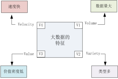 那么到底什么是大数据呢?大数据是指超出了常规数据库获取、存储、管理和分析能力的数据集合。在总数据量相同的情况下,与个别分析独立的小型数据集相比,合并后进行分析可得出许多额外的信息和数据关系性(WIKI)。大数据一般具有四个基本特种,如下图5所示: