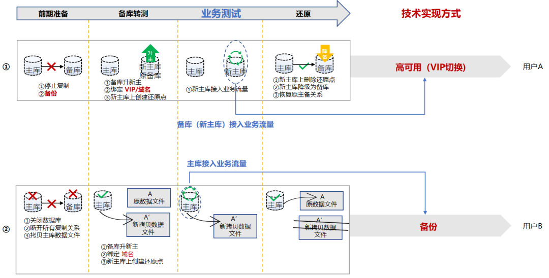 有的用户通过高可用方式实现,有的用户通过主库备份方式实现。整个转生产测试需要的能力和执行顺序不同,要么通过编写脚本,要么通过运维平台的定制化开发来实现。