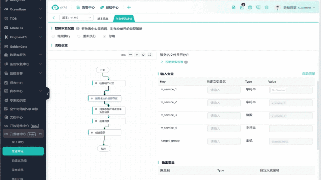 为了解决这个问题,zCloud 数据库云管平台引入开放运维中心,允许用户将基本功能封装为原子能力, 通过简单的拖拽和连线,编排业务流程并配置可视化界面,以搭积木的方式快速满足个性化的运维需求。