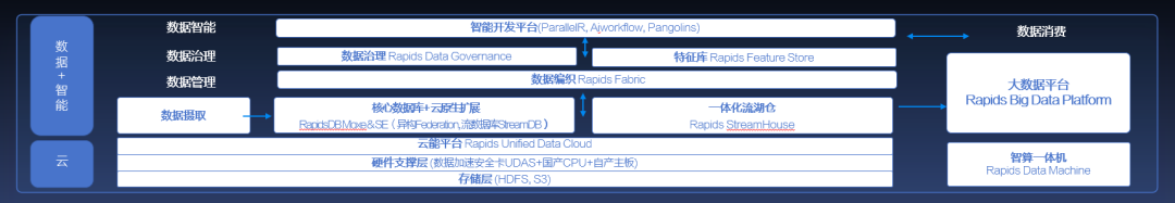 柏睿数据以“全内存分布式计算引擎”为核心,自主创新研发了新一代高性能、标准化、全智能的数据智能产品体系,为用户提供覆盖数据全生命周期应用的数据洞察方案。目前,柏睿数据形成了以全内存分布式数据库RapidsDB、大数据平台Rapids Lizard、云能平台Rapids Data Cloud等为代表的数据管理与分析软件产品系列、以向量数据库Rapids VectorDB、数据智能平台Rapids AI等为代表的AIGC软件产品系列,以及智算一体机Rapids Hypercube、数据加速&安全芯片等为代表的软硬一体产品系列。