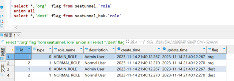 select *,'dest' flag from seatunnel_bak.`role`