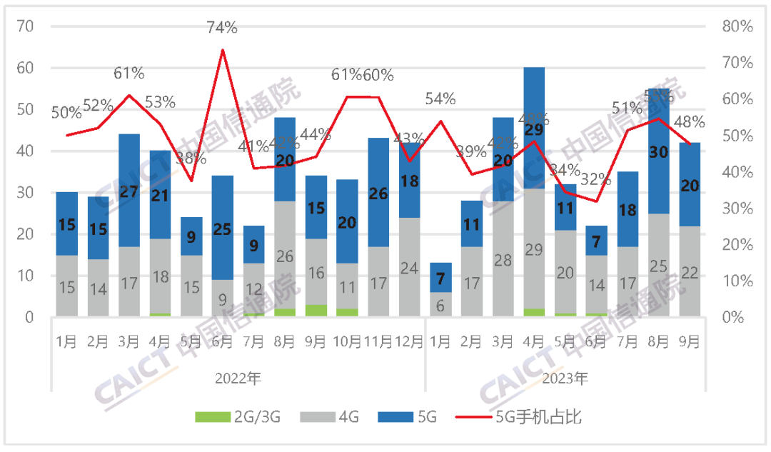 2023年9月,国内手机上市新机型42款,同比增长23.5%,其中5G手机20款,同比增长33.3%,占同期手机上市新机型数量的47.6%。
