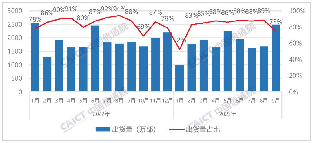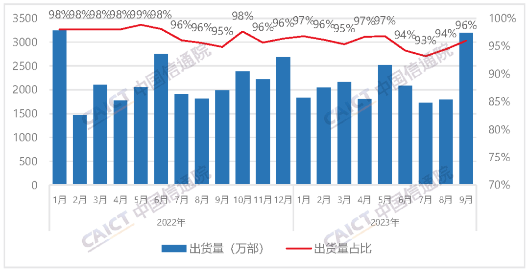 2023年9月,智能手机出货量3193.4万部,同比增长60.9%,占同期手机出货量的96.0%。2023年1-9月,智能手机出货量1.92亿部,同比增长0.3%,占同期手机出货量的95.6%。