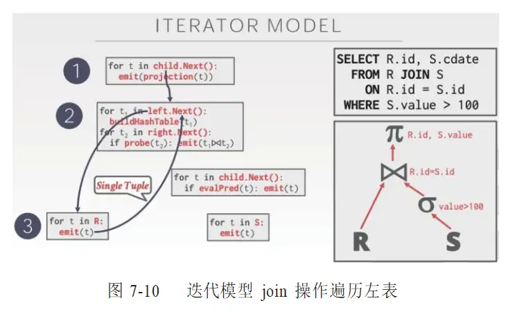 当前 AntDB 的分布式执行引擎采用经典的迭代模型(Iterator Model)又称火山模型(Volcano Model)。执行计划中的每个算子都需要实现 next 函数, 上游算子每一次递归调用,内部都会调用其输入的 next 函数,再层层返回结果。PostgreSQL、MySQL、SQL Server、DB2、Oracle 等传统关系型数据库基本都采用这种计算模型。如图 7-10、图 7-11 所示是迭代模型实现两表 join 操作的处理流程。