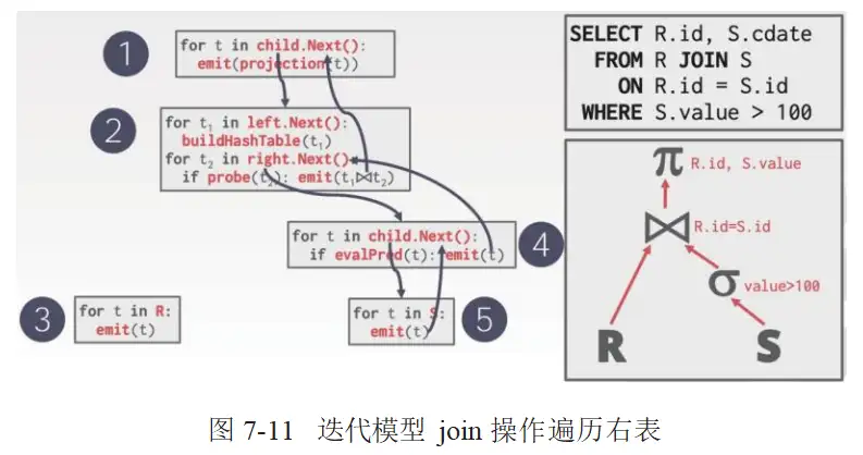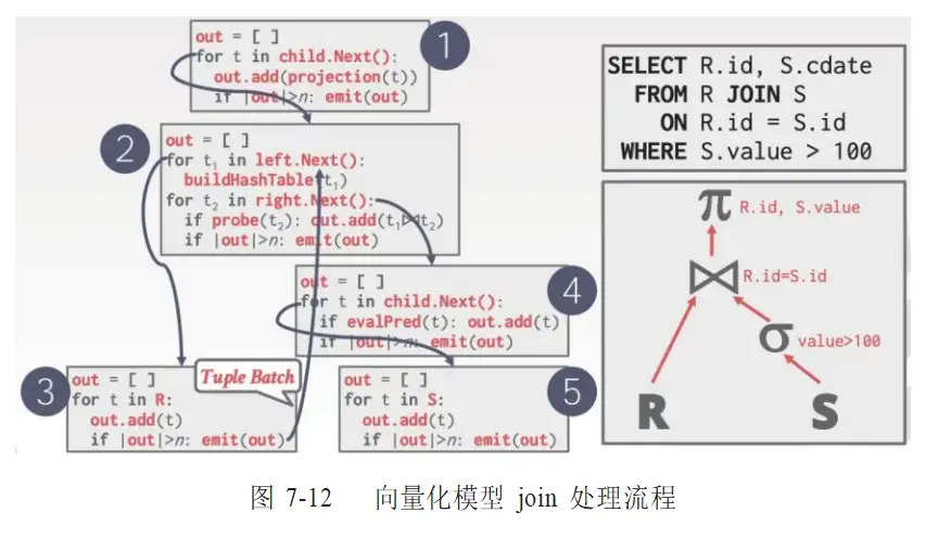 向量化模型和迭代模型类似,每个算子都需要实现一个 next 函数,但是每次调用 next 函数会返回一批元组(tuples)而不是一个元组。在算子内部,每次循环都会处理多个元组。批次的大小可以根据硬件或者查询数据进行配置。向量化模型实现两表 join 操作的处理流程如图 7-12 所示。