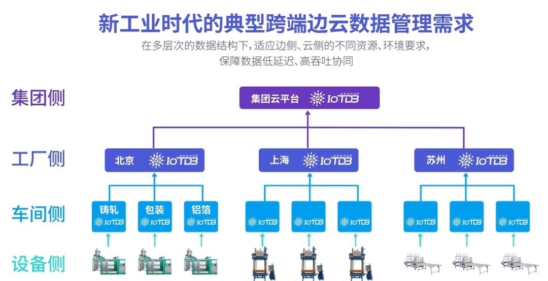 工业互联网场景下,以设备、传感器等终端上报的时序数据,成为多行业的价值主体。而工业互联网时代是端边云协同的时代:端是终端装备,用于采集数据;边是边缘控制器,用于汇集数据;云是云端服务器,用于处理数据。这种“端侧采集、边侧汇聚、云上处理”的数据上行链路,和“云上训练、边上推理、端侧执行”的数据下行链路,构成了工业互联网端边云场景的闭环。