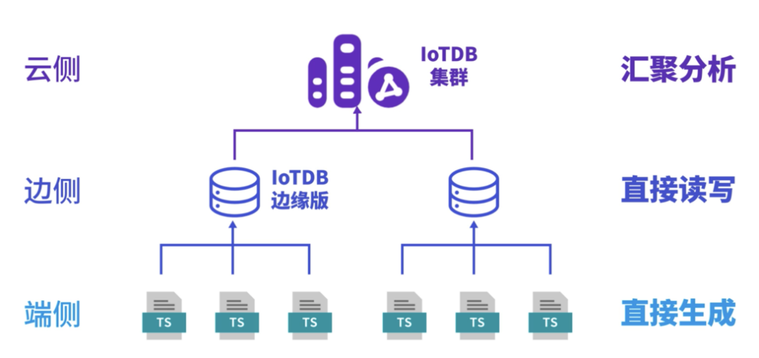 在端侧,IoTDB 全新研制了基于 C++ 的数据库文件形态产品,在数十 M 甚至数 M 内存下,能够以 10 倍以上压缩率、百万点每秒吞吐率实现单设备全量数据管理。在边侧,IoTDB 升级了单机数据库形态产品,在 10M 到 GB 内存下,实现多设备全量长周期数据管理。在云侧,IoTDB 重制了分布式数据库形态产品,能够支持亿级测点,每秒数亿点读写吞吐,并创新了副本机制,较其他系统直接节省 30% 的存储和服务器。此外,IoTDB 天生的语言特性使其能够与当前大数据生态无缝衔接。通过上述三类产品形态,实现了端-边-云多场景的全面覆盖,解决了端侧、边侧设备存储能力弱、丢失细节数据的痛点。