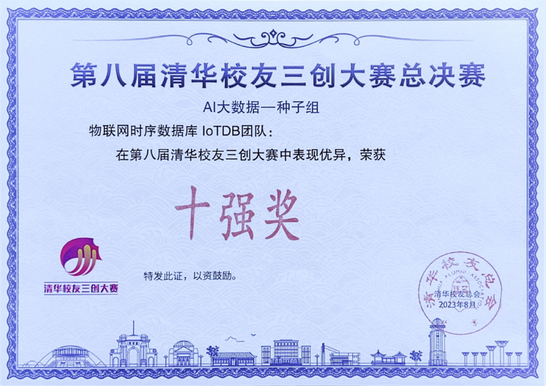 2023 年 8 月 29 日,第八届清华校友三创大赛人工智能与大数据全球总决赛在天津武清举办。围绕创始团队配置,技术产品创新性、示范性、引领性,商业模式、市场前景、社会价值等多个维度,来自全球各地清华校友团队经过严格评审,最终各组评选出大赛最高奖项:项目十强。物联网时序数据库 IoTDB 位列十强名单首位,荣获大赛最高奖项。